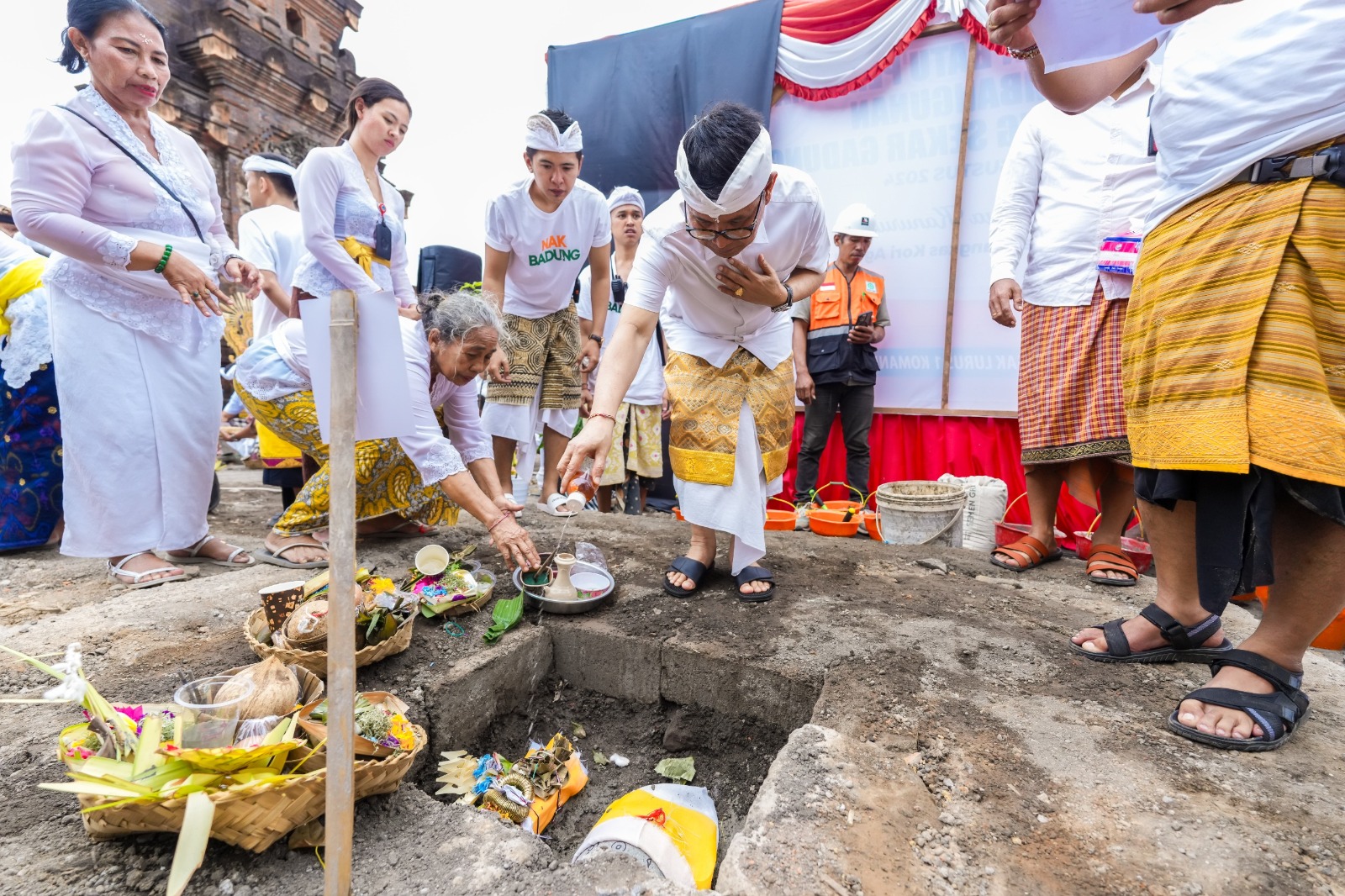 MENDEM DASAR – Sekda Adi Arnawa saat mendem dasar di pondasi tempat berdirinya bangunan Pelinggih Gedong Sari di Pura Hyang Sekar Gadung, Banjar Peliatan, Kerobokan, Kuta Utara, Rabu (21/8).