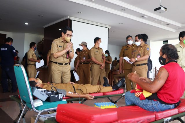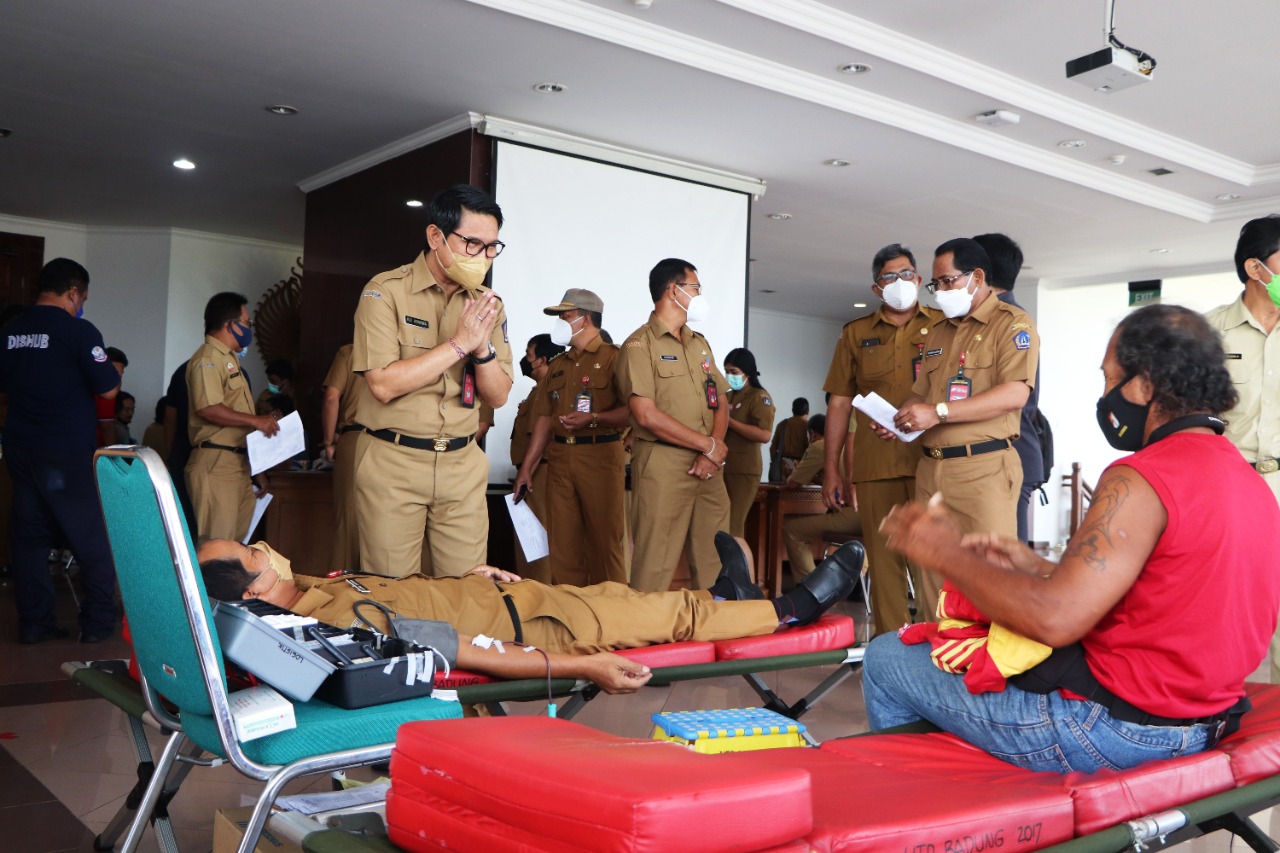 Dalam rangka memperingati Hari Ulang Tahun (HUT) ke-12 Mangupura, ASN di lingkungan Pemerintahan Kabupaten Badung menggelar acara donor darah di lobi Kertha Gosana Puspem Badung, Senin (15/11). Acara yang mengambil tema “Bayu Mukti Parahita” yang berarti Bersama Masyarakat, Badung Berjuang Menuju Pemulihan Ekonomi. Turut hadir Sekretaris Daerah (Sekda) I Wayan Adi Arnawa, sekaligus melakukan pemantauan donor darah terhadap para ASN di lingkungan Pemkab Badung.