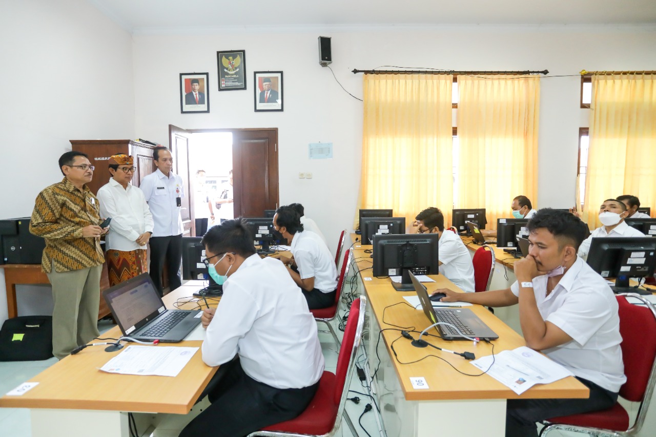 PPPK GURU – Sekda Badung Wayan Adi Arnawa saat memantau pelaksanaan seleksi kompetensi CAT-UNBK PPPK Guru dari pelamar umum, selasa (18/1) bertempat di SMPN 2 Kuta Utara Dalung.