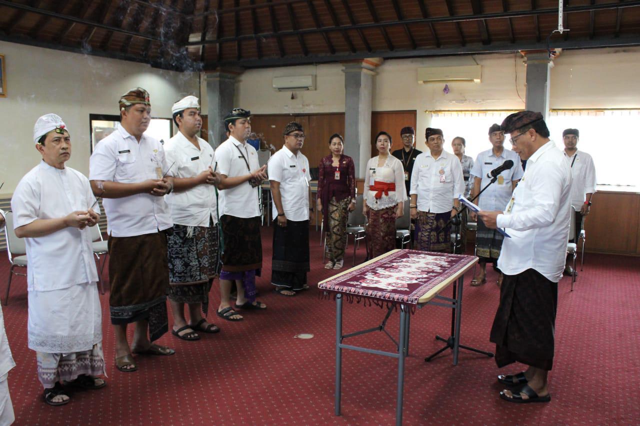 Sekda Kota Denpasar IB Alit Wiradana melantik 5 pejabat fungsional di lingkungan Pemkot Denpasar di aula Kantor Badan Kepegawaian dan Pengembangan Sumber Daya Manusia (BKPSDM) Kota Denpasar, Kamis (25/7). Sekda Alit Wiradana mengambil sumpah jabatan dr. I Wayan Widana, Sp.AN saat ini telah diangkat dalam jabatan fungsional Dokter Ahli Utama di lingkungan Pemerintah Kota Denpasar. Dalam kesempatan tersebut juga dilantik 1 jabatan fungsional PBJ dan 3 jabatan fungsional pengembangan kewirausahaan.