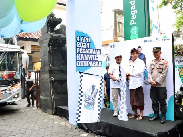 Sekda Kota Denpasar melepas secara resmi Mudik Bersama BUMN serangkaian Idul Fitri 1445 Hijriah yang digelar PT Pegadaian Kantor Wilayah VII yang ditandai dengan pengibasan bendera di Kantor Pegadaian Jalan Raya Puputan, Denpasar, Kamis (4/4). Mudik bersama ini dilaksanakan BUMN guna memberikan keamanan dan kenyamanan bagi para nasabah untuk menikmati lebaran di kampung halaman.