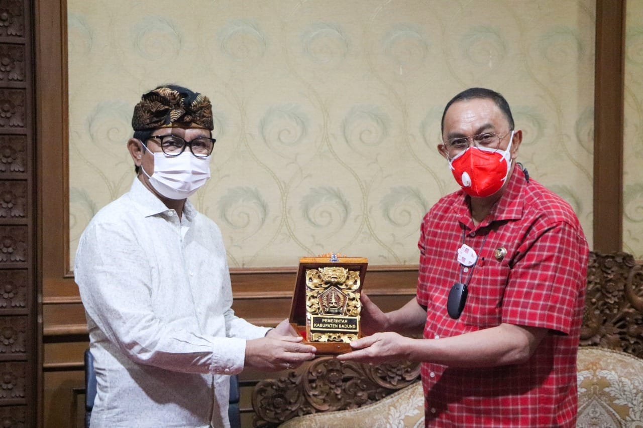 Sekretaris Daerah Kabupaten Badung I Wayan Adi Arnawa di samping Kepala Dinas Pertanian dan Pangan I Wayan Wijana, Kepala Dinas Pengendalian Penduduk Keluarga Berencana, Perlindungan Perempuan dan Perlindungan Anak I Putu Eka Merthawan menerima kunjungan kerja dari Kabupaten Minahasa. Kunja ini dikoordinir langsung oleh Bupati Minahasa Royke Octavian Roring selaku ketua rombongan Bersama jajarannya terkait sumber pariwisata pascapandemi covid-19, bertempat di Puspem Badung, Kamis (16/12).