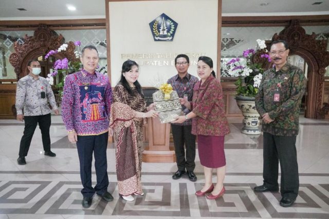 GUNUNG MAS – Sekda Wayan Adi Arnawa bersama Ketua Dekranasda Badung Nyonya Seniasih Giri Prasta menerima kunja Bupati Gunung Mas Jaya Samaya Monong dan Ketua Dekranasda Gunung Mas Nyonya Mimie Mariatie Jaya Samaya Monong di Ruang Tamu Bupati Badung, Puspem, Jumat (1/7).