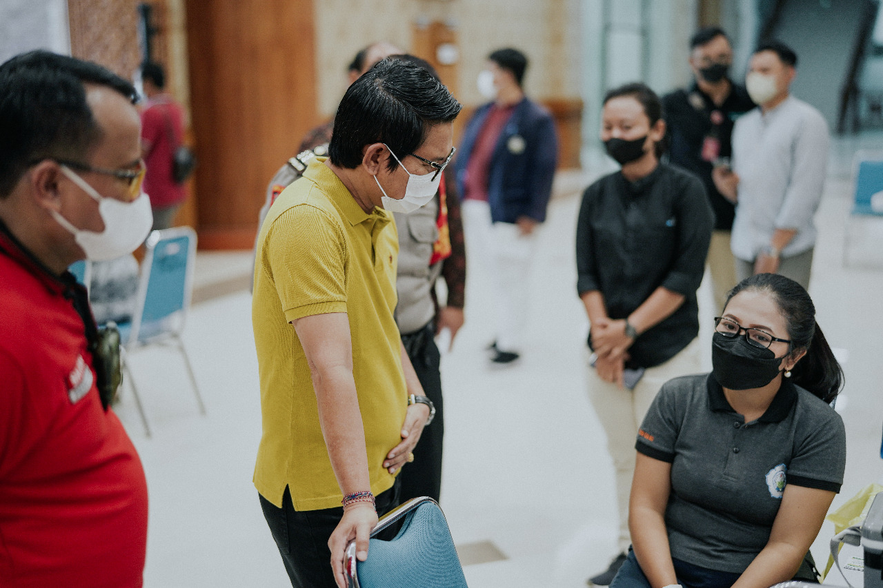 Sekretaris Daerah Kabupaten Badung I Wayan Adi Arnawa selaku Ketua Forum Kerukunan Umat Beragama (FKUB), turun langsung meninjau pelaksanaan vaksinasi booster yang diselenggarakan oleh Polres Badung, di Gedung Balai Budaya Giri Nata Mandala, Puspem Badung, Sabtu (12/3). Pengecekan yang lebih memfokuskan petugas yang melayani selain sarana dan prasarana yang digunakan, juga mengawasi ketaatan masyarakat terhadap protokol kesehatan. Turut hadir Waka Polres Badung Kompol I Ketut Dana, S.H., Kepala Pelaksana (Kalaksa) BPBD I Wayan Darma dan jajaran FKUB.