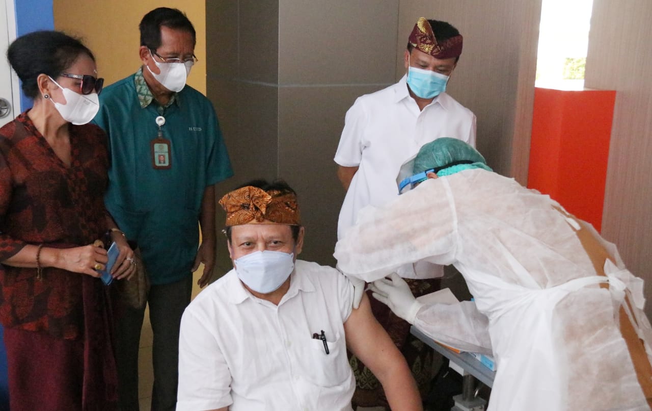Sekretaris Daerah Dewa Made Indra yang juga selaku Ketua Harian Gugus Tugas Percepatan Penanganan Covid-19 Provinsi Bali membuka pos pelayanan vaksinasi Covid-19 di Rumah Sakit Perguruan Tinggi Negeri (RS PTN) Universitas Udayana Jimbaran Kabupaten Badung, Kamis (4/3/2021). Pembukaan pos pelayanan vaksinasi covid-19 ditandai dengan pemberian vaksinasi kepada guru besar dan civitas akademika di lingkungan Universitas Udayana.