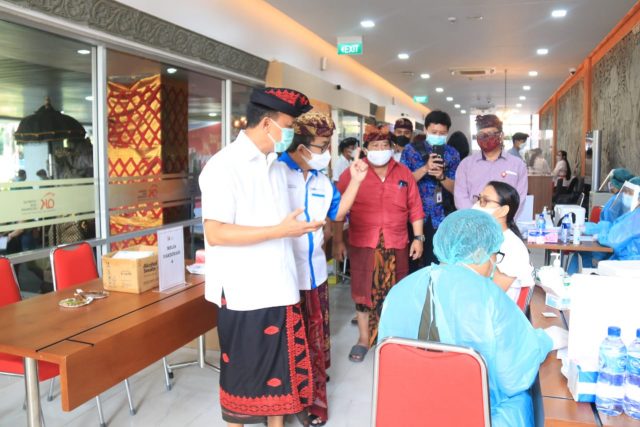 VAKSINASI – Sekda Bali Dewa Mde Indra meninjau vaksinasi covid-19 di Kantor OJK Regional 8 Bali-Nusra, Kamis (8/7).