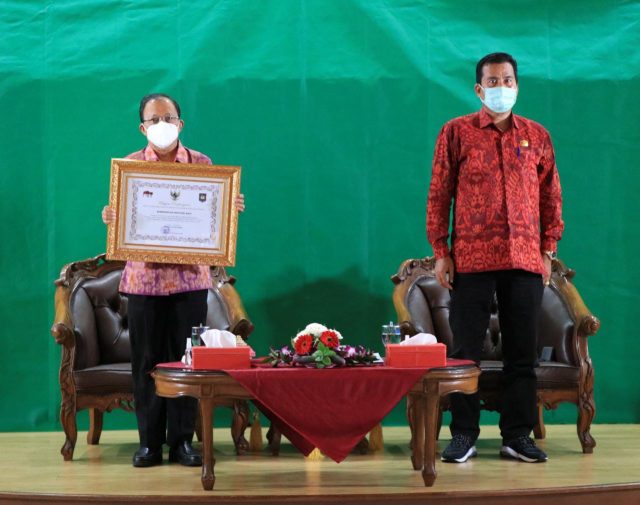TEPAT WAKTU – Gubernur Bali Wayan Koster menerima penghargaan dari Inspektorat Jenderal Kemendagri karena berhasil menyelesaikan tindak lanjut hasil pengawasan tepat waktu, Selasa (31/8/2021).