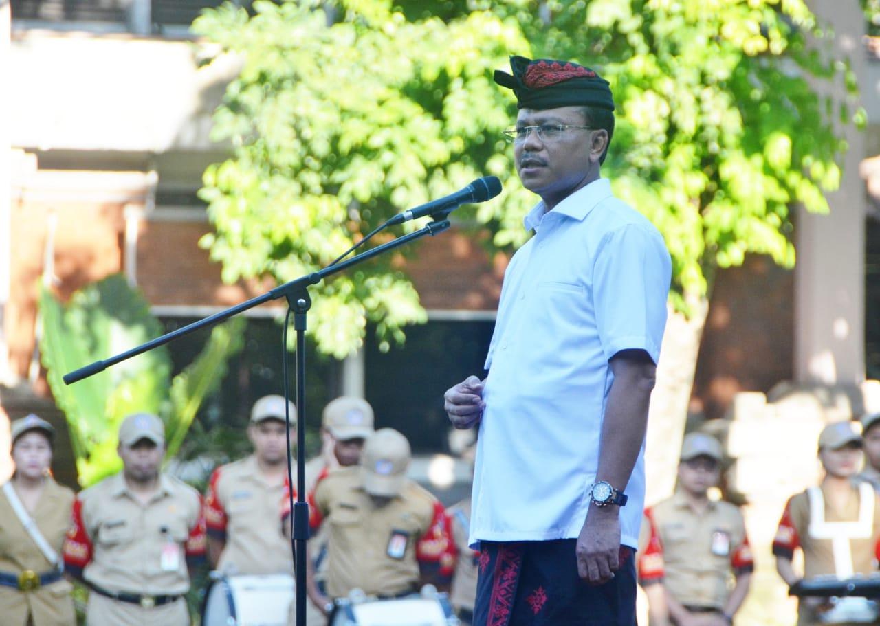 APEL – Sekda Dewa Made Indra saat memimpin apel Maret 2020.