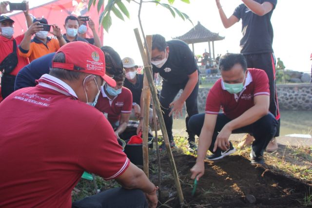 TANAM POHON – Sekda Provinsi Bali Dewa Made Indra menanam pohon serangkaian Bulan Bung Karno III di pantai Tangtu, Senin pagi (21/6).