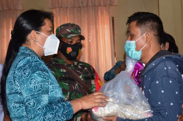 BANTUAN – Ketua TP PKK Kabupaten Badung Ny. Seniasih Giri Prasta serahkan bantuan sembako kepada 19 warga masyarakat di Abiansemal, Senin (26/4).