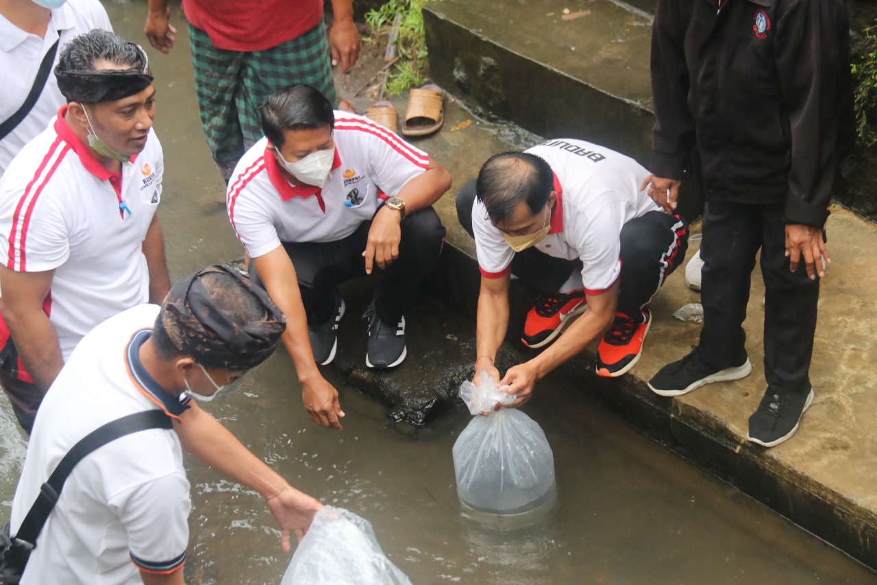 TEBAR BIBIT – Sekretaris DPRD Badung Gusti Agung Made Wardika menebar ikan di areal Beji Pura Puseh Desa Adat Sedang, Jumat (28/1/2022).