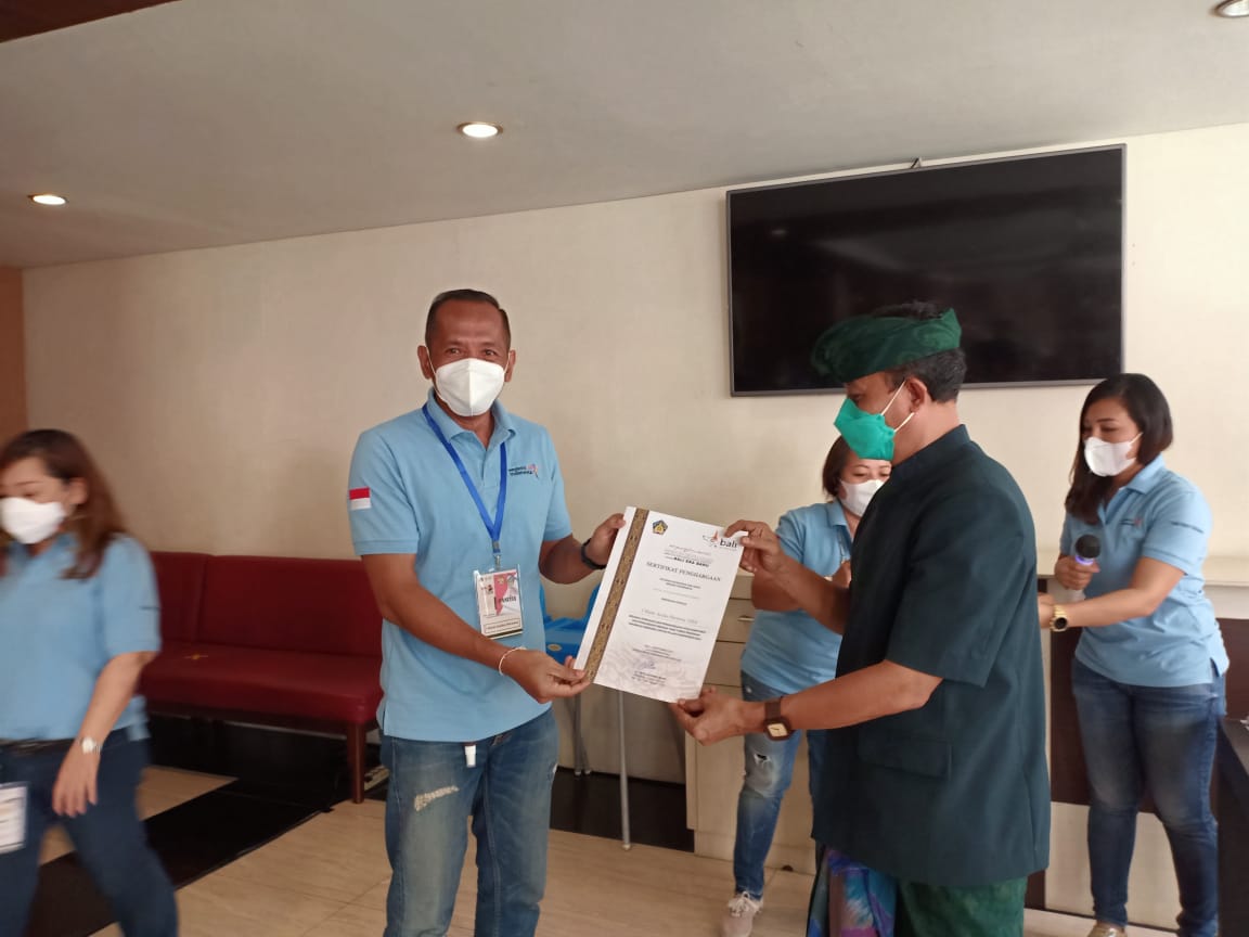 100 PERSEN – Kadis Pariwisata Bali Putu Astawa menyerahkan piagam sebagai pertanda 100 persen naker pariwisata sudah divaksin, Kamis (2/9/2021).