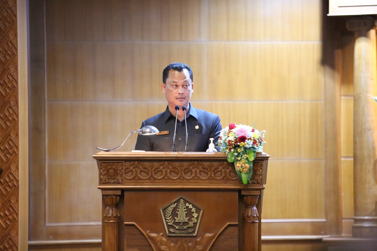 Fraksi PDI Perjuangan DPRD Badung menyampaikan pemandangan umum (PU) terhadap Rancangan Kebijakan Umum APBD (KUA) dan Rancangan Prioritas dan Plafon Anggaran Sementara (PPAS) Badung tahun 2022, pada sidang paripurna DPRD Badung, Jumat (6/8/2021). PU fraksi yang dikomando Gusti Anom Gumanti tersebut dibacakan oleh Wayan Sugita Putra.