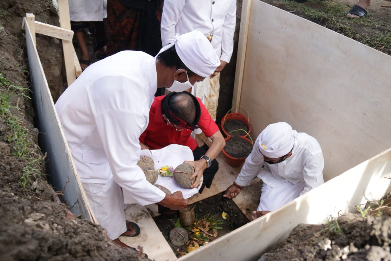 BATU PERTAMA – Gubernur Koster meletakkan batu pertama pembangunan Kantor MDA Jembrana, Kamis (20/8/2020).