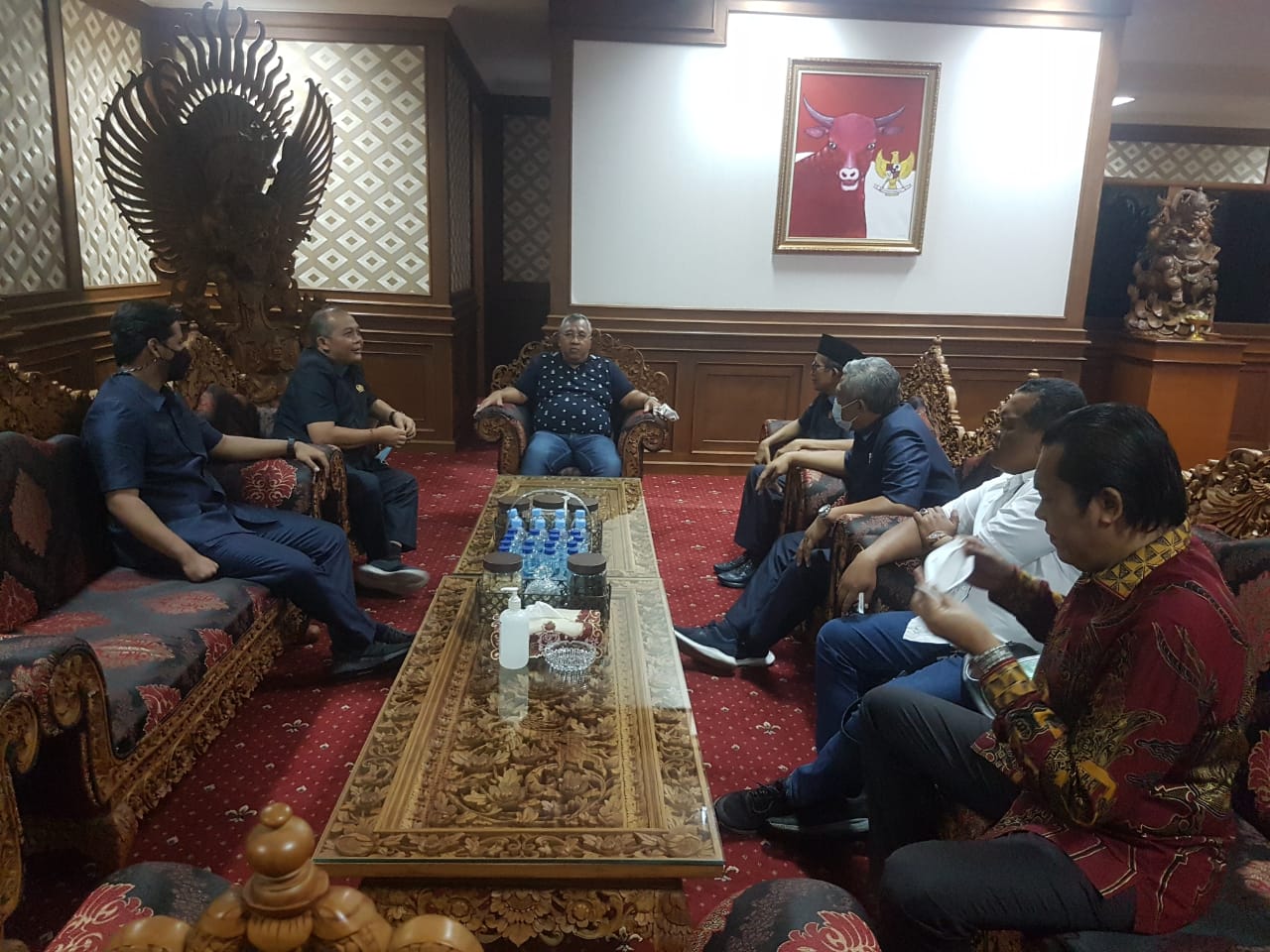 KOTA MALANG – Ketua DPRD Badung Putu Parwata saat menerima kunjungan Ketua DPRD Kota Malang Made Rian bersama tiga wakilnya di ruang kerjanya, Jumat (19/3).