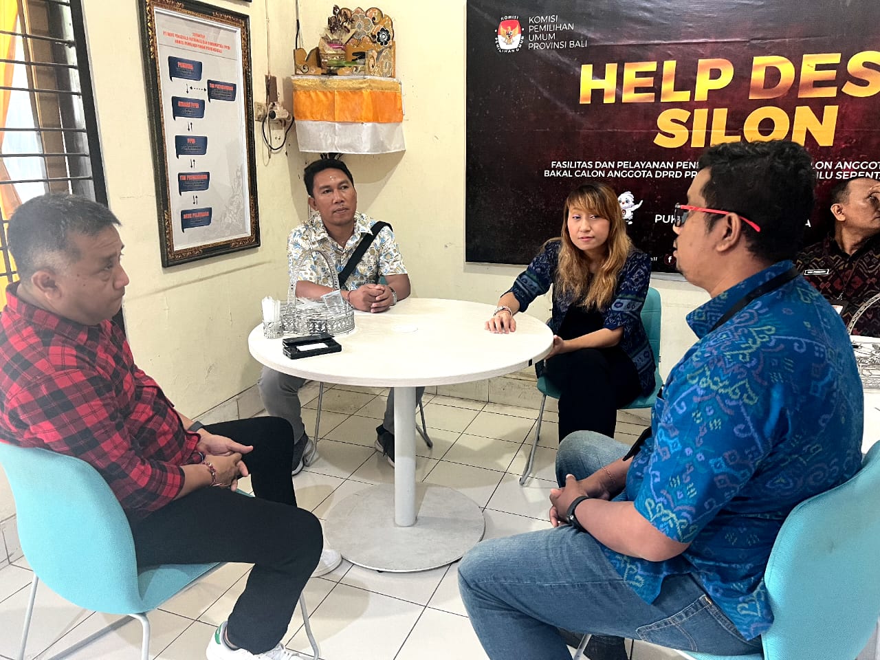 KOORDINASI – MUP3 Bali Selatan I Putu Kariana (baju biru), beserta manajemen UP3 Bali Selatan melakukan kordinasi dengan ketua KPU Provinsi Bali I Dewa Agung Gede Lidartawan (baju kotak-kotak merah) di kantor KPU Provinsi Bali.