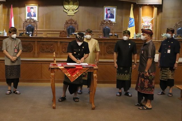 Setelah melalui beberapa tahapan Rapat Paripurna Dewan serta Rapat Kerja antara Dewan dan Pemerintah Daerah, dalam masa rapat paripurna kedua DPRD Badung, Kamis (15/7), Bupati Badung Nyoman Giri Prasta bersama pimpinan DPRD Kabupaten Badung menandatangani persetujuan bersama atas 2 (dua) rancangan peraturan daerah (ranperda). Keduanya, Ranperda Kabupaten Badung tentang Pertanggungjawaban Pelaksanaan APBD Kabupaten Badung Tahun Anggaran 2020 dan Ranperda Kabupaten Badung tentang Rencana Pembangunan Jangka Menengah Daerah (RPJMD) Semesta Berencana Kabupaten Badung tahun 2021-2026.