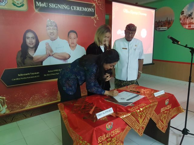 MOU – Ketua DPRD Badung Putu Parwata menyaksikan penandatanganan MoU antara CIS International dengan Marcelina, salah satu agenci dari Polandia, Selasa (20/12/2022).