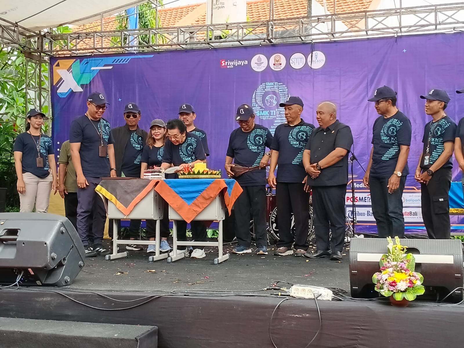 POTONG TUMPENG – Pembina Yayasan Prof. Made Bandem memotong tumpeng yang menandai puncak perayaan HUT ke-9 SMK TI Bali Global Badung, Sabtu (15/11/2025).