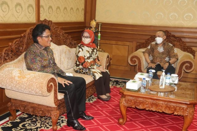 JOMBANG – Bupati Nyoman Giri Prasta didampingi Sekda Wayan Adi Arnawa menerima Bupati Jombang beserta rombongan saat kunjungan kerja ke Puspem Badung, Jumat (15/10).