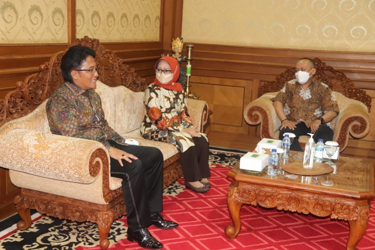 Bupati Badung I Nyoman Giri Prasta didampingi Sekda Badung I Wayan Adi Arnawa menerima kunjungan kerja (kunker) Bupati Jombang, Jawa Timur Hj. Mundjidah Wahab beserta pejabat terkait Pemkab Jombang di Puspem Badung, Jumat (15/10). Kunjungan ini dalam rangka studi banding serta tukar informasi terkait pembentukan dan pengembangan BUMD Pasar.