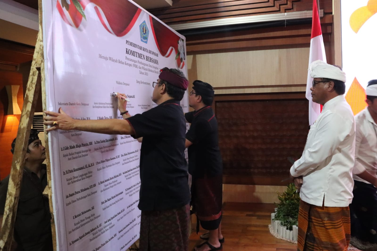 Seluruh organisasi perangkat daerah (OPD) Pemkot Denpasar pada Kamis (6/4) menandatangani komitmen bersama Pencanangan Pembangunan Zona Integritas (ZI) Menuju Wilayah Bebas Korupsi (WBK) dan Wilayah Birokrasi Bersih dan Melayani (WBBM) di Graha Sewaka Darma, Lumintag Denpasar. Tampak penandatanganan diawali oleh Walikota Denpasar I Gusti Ngurah Jaya Negara, Wakil Walikota I Kadek Agus Arya Wibawa, dan Sekda Kota Denpasar Ida Bagus Alit Wiradana dan selanjutnya diikuti oleh seluruh pimpinan OPD.