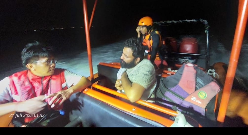 EVAKUASI – Tim SAR melakukan evakuasi terhadap kru kapal India yang tangannya remuk terjepit mesin kapal, Minggu (20/7/2025).