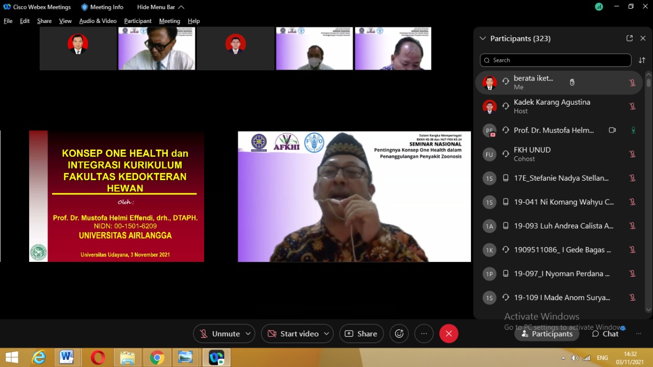 Pada Rabu, 3 November 2021, Fakultas Kedokteran Hewan (FKH) Universitas Udayana bekerja sama dengan Asosiasi Fakultas Dokter Hewan Indonesia (AFKHI) dan Food and Agriculture Organization (FAO) menyelenggarakan Seminar Nasional Revitalisasi Kurikulum FKH Berbasis One Health dalam Upaya Penanggulangan Penyakit Zoonosis secara daring. Seminar ini dihadiri oleh 317 peserta yang berasal dari berbagai sektor seperti dosen dan mahasiswa FKH se-Indonesia, praktisi kesehatan hewan, praktisi kesehatan manusia, alumni FKH Udayana dan masyarakat umum baik dalam maupun luar negeri.
