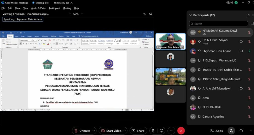 Penyakit mulut dan kuku (PMK) telah menyebar hingga ke berbagai daerah di Indonesia. Dalam upaya menanggulangi penyebaran di Provinsi Bali, Fakultas Peternakan Universitas Udayana (Fapet Unud) turut ambil tindakan dengan membentuk Tim Satuan Tugas (Satgas) PMK bekerja sama dengan Dinas Pertanian dan Ketahanan Pangan Provinsi Bali dan Sub Bagian Peternakan di seluruh daerah Provinsi Bali. Sebelum membentuk Tim Satgas, Fapet Unud melaksanakan rapat koordinasi yang dilaksanakan pada Minggu, (10/7/2022).