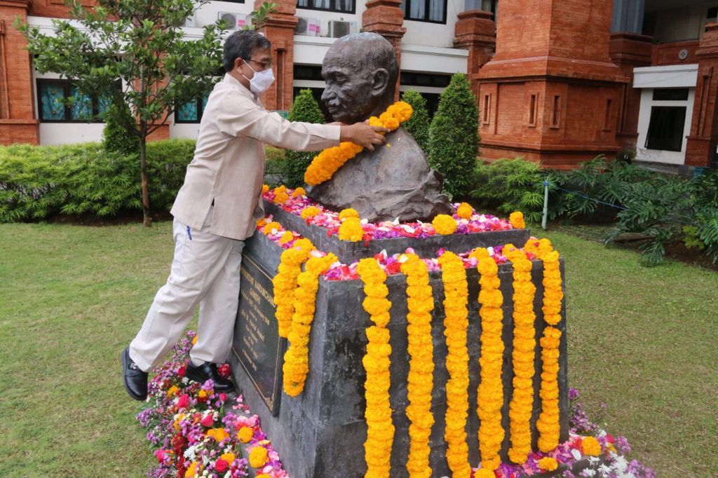 Konsul Jenderal India Prakash Chand berkunjung ke Universitas Udayana Kampus Sudirman Denpasar, Sabtu (2/10/2021). Kunjungan ini dalam rangka penaburan bunga di patung Mahatma Gandhi yang berada di depan Gedung Agrokompleks Kampus Unud Sudirman Denpasar berkenaan dengan perayaan Birth Anniversary of Mahatma Gandhi.