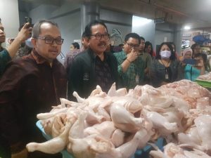 PANTAU HARGA – Kepala KPw BI Provinsi Bali Trisno Nugroho saat mendampingi Wagub Cok. Ace memantau harga-harga di Pasar Badung Denpasar, Selasa (31/1/2023).