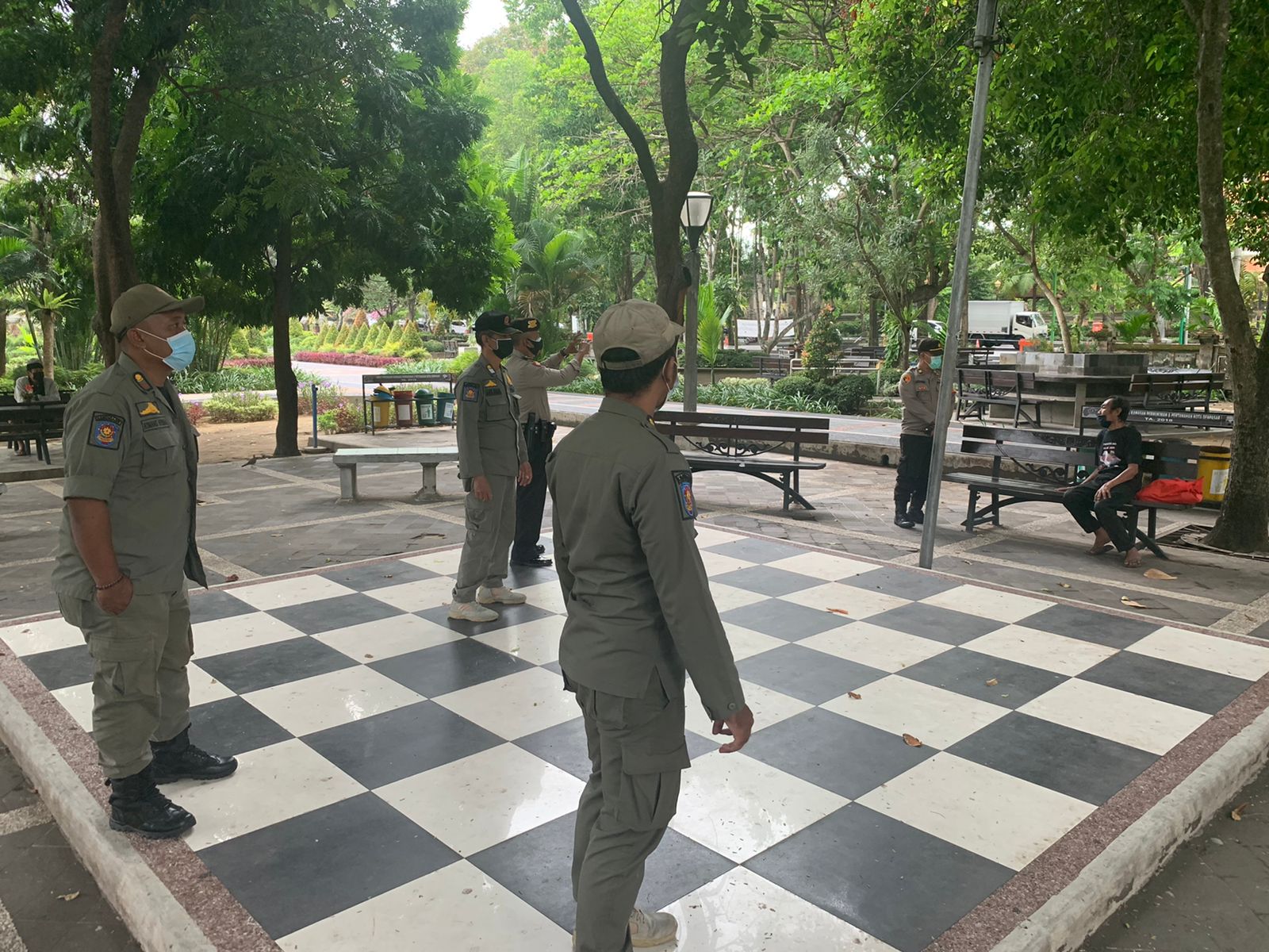 FASILITAS PUBLIK – Tim Yustisi memantau sejumlah fasilitas publik dalam rangka menekan penyebaran covid-19, Sabtu (11/9/2021).