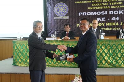 Program Studi Doktor Ilmu Teknik (PSDIT) Fakultas Teknik Universitas Udayana pada Selasa, 18 Oktober 2022, pukul 10.00 wita bertempat di Ruang Aula Wiswakarma Universitas Udayana, melaksanakan ujian terbuka (promosi Doktor) yang ke-44. Promovendus atas nama Putu Doddy Heka Ardana dengan judul disertasi Pemodelan Imbuhan Air Tanah Berdasarkan Fluktuasi Muka Air Tanah pada Akuifer Kota Denpasar. Masa studi promovendus adalah 2 tahun 7 bulan dan dinyatakan lulus dengan predikat cumlaude (dengan pujian).