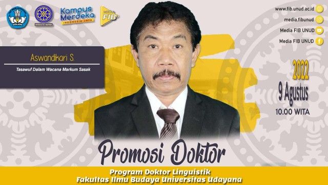 Program Studi Linguistik Program Doktor, Fakultas Ilmu Budaya, Universitas Udayana menyelenggarakan Promosi Doktor dengan promovendus Aswandikari, Selasa (9/8/2022) secara hybrid di ruang Dr. Ir. Soekarno, Gedung Poerbatjaraka, FIB Unud. Promovendus adalah dosen Universitas Mataram (Unram) NTB. Ujian terbuka dipimpin oleh Dekan FIB Unud, Dr. Made Sri Satyawati, S.S., M.Hum. serta didampingi oleh Promotor, Prof. Dr. I Nyoman Weda Kusuma, M.S. serta Kopromotor I, Prof. Dr. I Nyoman Suarka, M.Hum., dan Kopromotor II, Dr. Drs. Ida Bagus Rai Putra, M.Hum.