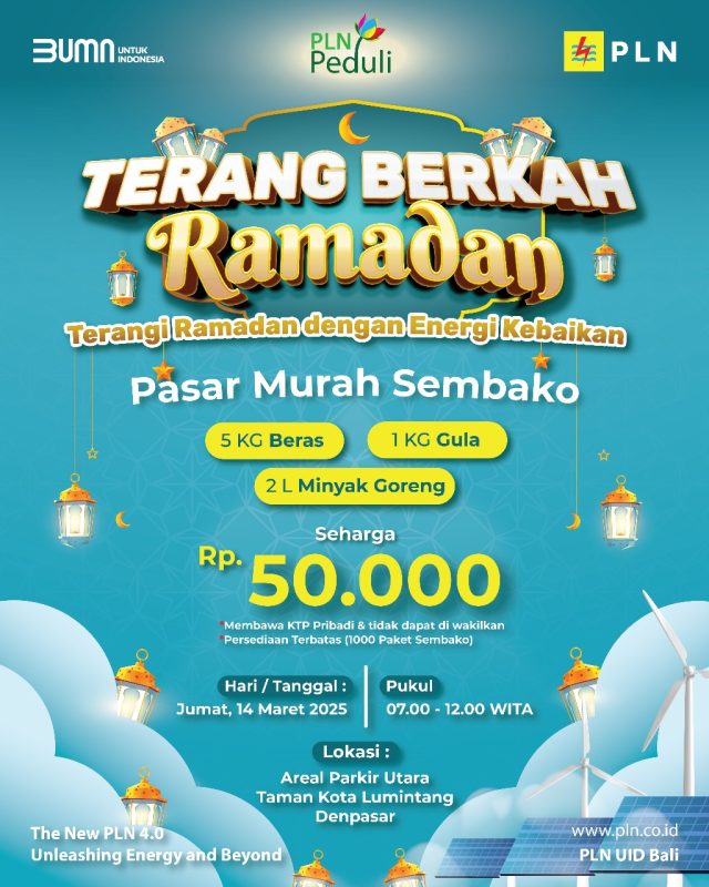 Menyambut bulan suci Ramadhan yang penuh berkah, PT PLN (Persero) akan menggelar pasar murah sembako untuk masyarakat umum di seputaran Kota Denpasar. Kegiatan yang bertajuk “Terang Berkah Ramadan” ini akan menawarkan 1.000 paket sembako dengan harga terjangkau yakni 50 ribu rupiah per paketnya.