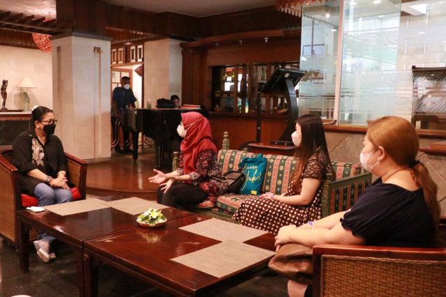 MS GLOBAL – Ketua Dekranasda Bali Ny. Putri Koster menerima audiensi panitia Ms Global di Inna Grand Bali Beach Sanur, Minggu (10/4/2022).