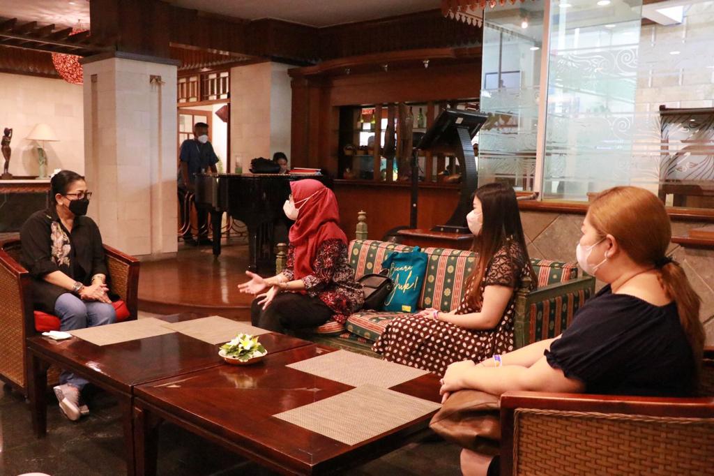 Ketua Dekranasda Provinsi Bali Ny. Putri Koster didampingi Kepala Dinas Perindustrian dan Perdagangan (Disperindag) Provinsi Bali, I Wayan Jarta menerima audiensi dari Director Miss Global dari PT Mahakarya Duta Pesona Indonesia Dr. Kishanty Hardaningtyas MBiomed AAM, di Rajapala Snack Bar, Inna Grand Bali Beach, Sanur, Minggu (11/4/2022).
