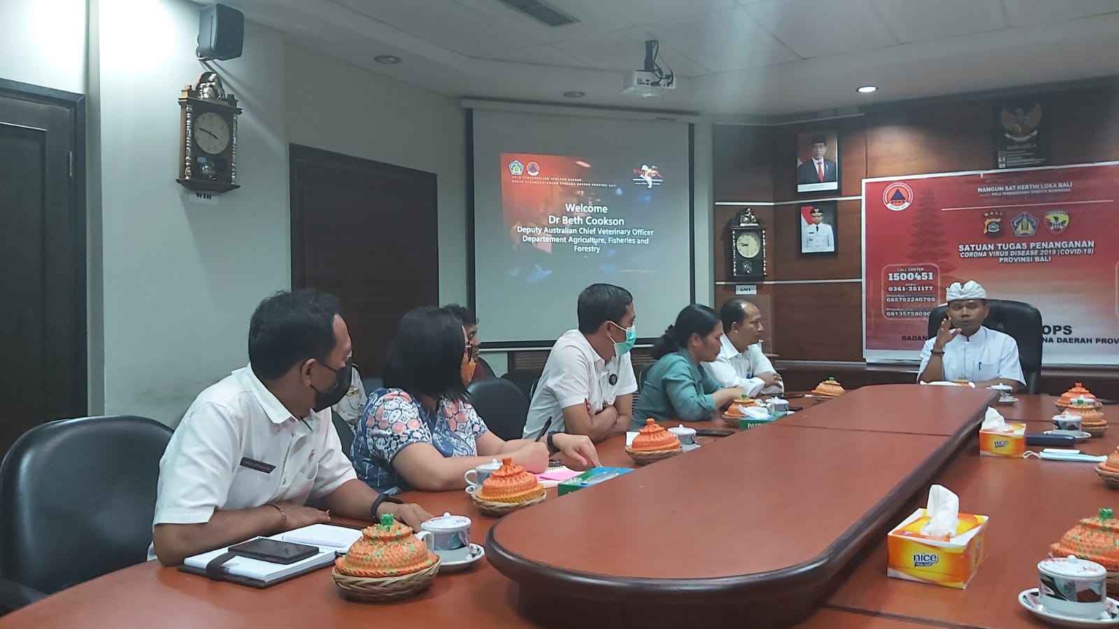 Di hadapan sejumlah tim Pertanian Australia pihaknya menambahkan bahwa penguatan Bioscurity dilakukannya bersama instansi terkait dalam rangka pembebasan Penyakit Mulut dan Kuku (PMK) di Provinsi Bali. “Kami dari BPBD Provinsi Bali membentuk tim reaksi cepat sudah turun ke beberapa daerah berbasis kecamatan untuk melakukan desfinasi penyemprotan terhadap hewan dan ternak warga. Hal ini rutin kami lakukan agar tidak terjadi pengembangan drastis terhadap penyakit mulut dan kuku pada hewan ternak,” ungkapnya dalam rapat bersama tim pertanian dari negara Australia yang didampingi oleh balai karantina, di Ruang Pusdalops, Rabu (5/10).