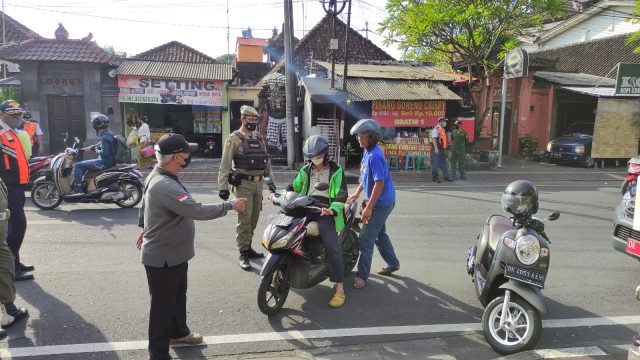 PROKES – Penertiban prokes di simpang Jalan Imam Bonjol dan Jalan Batukaru Denpasar, Selasa (12/4).