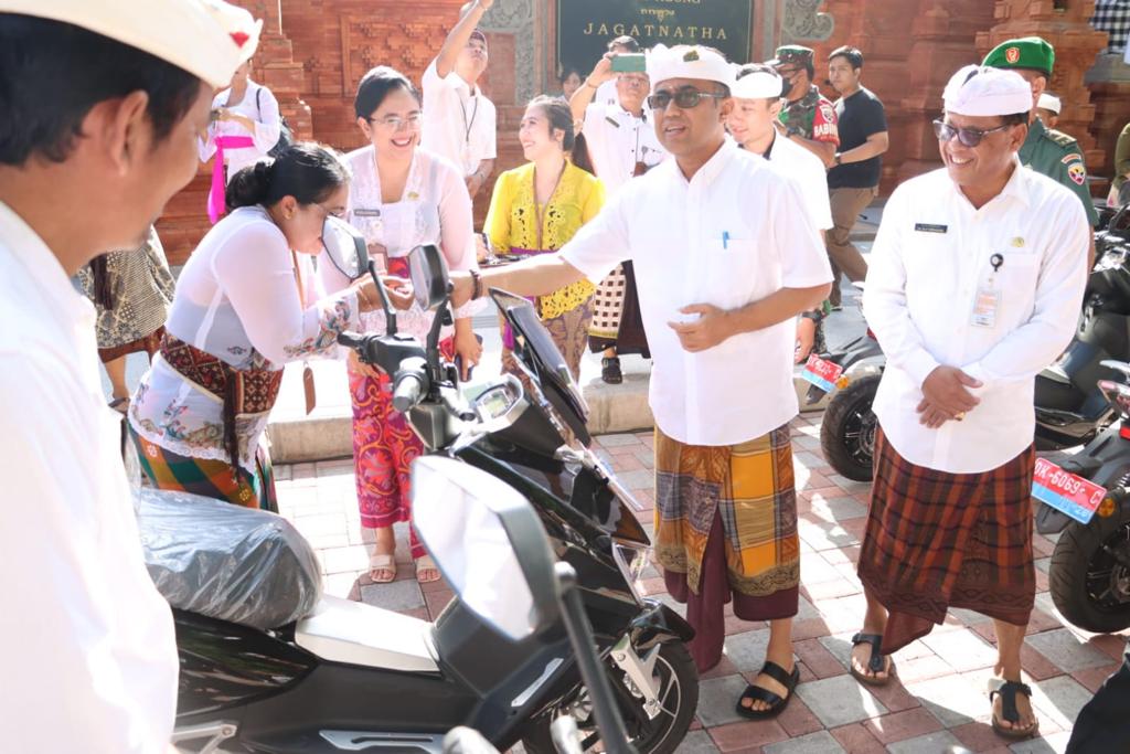 Sebanyak 142 unit Kendaraan Bermotor Listrik Berbasis Baterai (Battery Electric Vehicle) atau disebut KBL diserahkan Walikota Denpasar I Gusti Ngurah Jaya Negara secara simbolis kepada desa/lurah, Babinsa dan Bhabinkamtibmas, Selasa (12/12) di Jaba Pura Agung Jagatnatha.