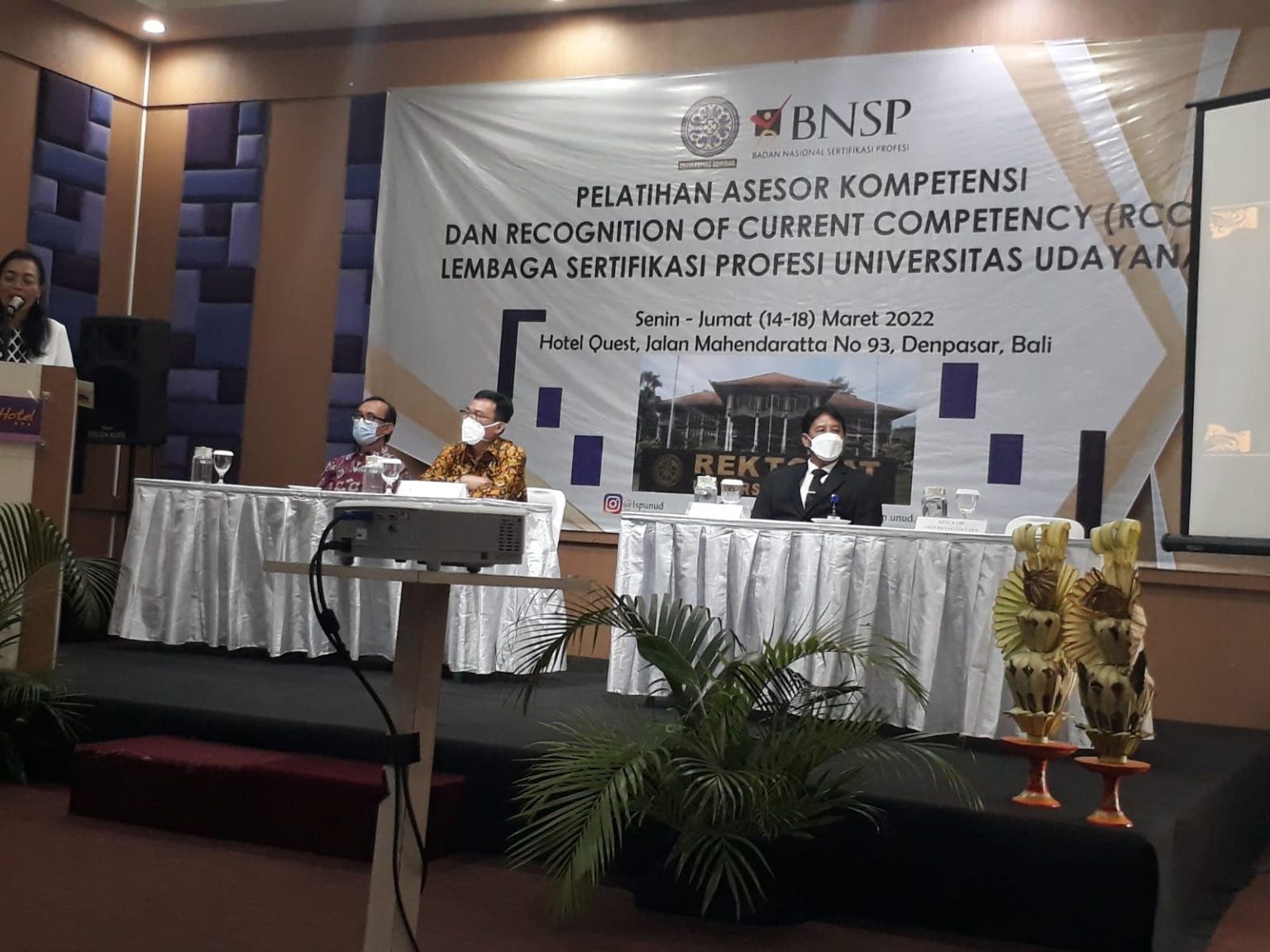 Dekan Fakultas Pariwisata Unud, Dr. I Wayan Suardana, SST. Par, M. Par., menghadiri pembukaan Pelatihan Asesor Kompetensi dan Perpanjangan Sertifikat Asesor atau Recognition Current Competency (RCC) yang digelar di Hotel Quest Hotel Sam Denpasar, Senin (14/3). Kegiatan tersebut merupakan insiatif Sertifikasi Profesi Universitas Udayana yang diikuti oleh 71 orang peserta yang berasal dari berbagai fakultas di Unud termasuk dari Fakultas Pariwisata, khususnya bidang perhotelan. Kegiatan ini akan berlangsung dari 14-18 Maret 2022. Master Asesor didatangkan dari Badan Nasional Sertifikasi Profesi (BNSP) Jakarta.