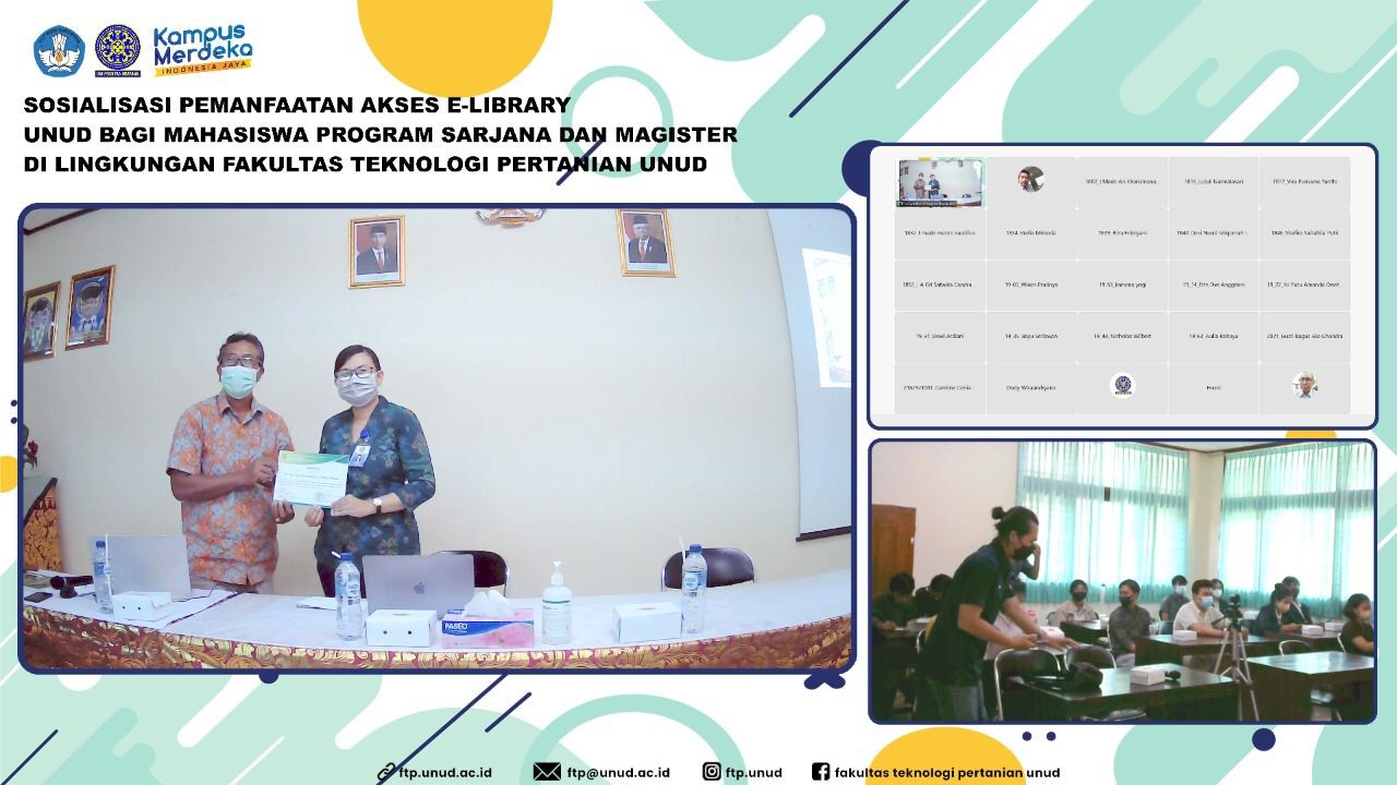 Untuk meningkatkan kompetensi mahasiswa, Fakultas Teknologi Pertanian Universitas Udayana menyelenggarakan sosialisasi pemanfaatan Akses E-Library Universitas Udayana pada Jumat, 8 April 2022 di Ruang Sidang FTP, Gedung GA Lantai II, Fakultas Teknologi Pertanian Kampus Bukit Jimbaran secara hybrid.