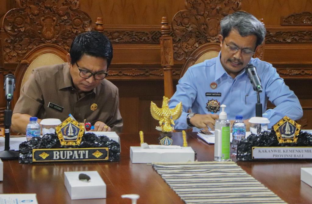 Sekretaris Daerah Kabupaten Badung I Wayan Adi Arnawa mewakili Bupati Badung melaksanakan penandatangan nota kesepakatan (MoU) antara Pemerintah Kabupaten Badung dengan Kementerian Hukum dan Hak Asasi Manusia (Kemenkumham) Kantor Wilayah Bali tentang Konsolidasi dan Pelayanan Hukum dan Hak Asasi Manusia (HAM) dalam penyelenggaraan urusan pemerintah daerah di Kabupaten Badung, Senin (24/10) di Ruang Nayaka Gosana I, Puspem Badung. Turut hadir tim dari Kemenkumham Kantor Wilayah Bali yang dipimpin Anggiat Napitupulu, Inspektur Luh Suryaniti, Kepala Kesbangpol I Nyoman Suwendi, Kadis Penanaman Modal dan Pelayanan Terpadu Satu Pintu Made Agus Aryawan, Kadis Koperasi, UKM dan Perdagangan Made Widiana, Kabag Kerjasama IA Yutri Indah Gustari, Kabag Hukum AA Asteya Yudhya.