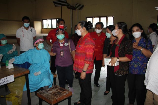Ketua Tim Penggerak PKK Kabupaten Badung Ny. Seniasih Giri Prasta bersama Wakil Ketua TP PKK Ny. Kristiani Suiasa meninjau pelaksanaan posyandu balita dan lansia sekaligus menyerahkan sembako di Banjar Kuwum, Kelurahan Kerobokan Kelod, Selasa (11/5). Acara juga dihadiri Camat Kuta Utara I Putu Eka Permana, Lurah Kerobokan Kelod Made Wistawan serta Kepala Lingkungan dan Kelian Adat Br. Kuwum. Usai penyerahan sembako 42 paket kepada posyandu balita dan lansia, dilanjutkan dengan pemantauan vaksinasi di Kantor Desa Tibubeneng sembari membagikan masker kepada WNA dan masyarakat setempat.