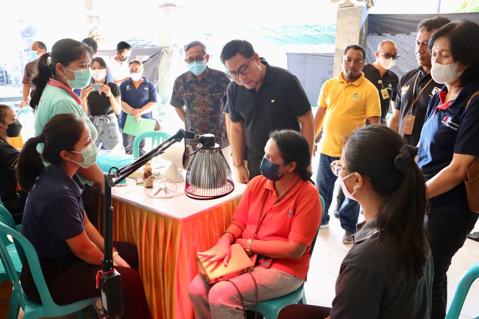 CEK MATA – Selain meninjau, Wawali Arya Wibawa ikut cek kesehatan mata saat safari kesehatan di Desa Peguyangan Kangin, Jumat (4/11/2022).