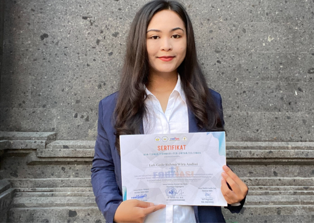 Mahasiswa Program Studi Sarjana Manajemen Fakultas Ekonomi dan Bisnis Universitas Udayana (FEB Unud) angkatan 2020, Luh Gede Rahma Wira Andini berhasil meraih Juara III pada ajang perlombaan Esai Nasional Formasi FEB Universitas Tanjungpura pada Bulan Maret lalu dengan Dosen Pembimbing yakni Dr. Gede Bayu Rahanatha, SE, MM. Esai Nasional Formasi FEB Untan (Esnas) merupakan perlombaan karya tulis diperuntukkan bagi mahasiswa Diploma/S1/sederajat yang diselenggarakan oleh UKM Forum Mahasiswa Ilmiah atau FORMASI FEB Tanjungpura.