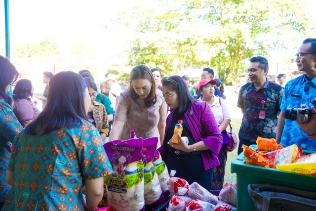 Ketua Tim Penggerak (TP) PKK Kabupaten Badung Ny. Rasniathi Adi Arnawa didampingi Ny. Yunita Alit Sucipta menghadiri kegiatan Gerakan Pangan Murah (GPM) dalam rangka menyongsong Hari Raya Kuningan serta menjaga stabilitas pasokan dan harga pangan. Acara berlangsung di Lapangan depan Kantor Desa Bongkasa, Kecamatan Abiansemal, Selasa (29/4).