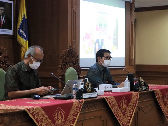 EVALUASI – Sekda Adi Arnawa saat memimpin HLM evaluasi program kerja selama tahun 2021, Selasa (14/12) di ruang Kriya Gosana, Puspem Badung.
