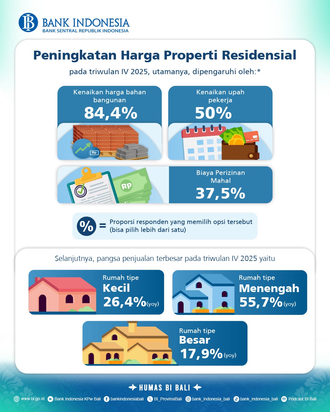 Pertumbuhan IHPR pada triwulan IV 2025 utamanya didorong oleh kenaikan harga bangunan akibat meningkatnya harga faktor produksi. Sejalan dengan triwulan sebelumnya, mayoritas responden menyatakan bahwa kenaikan harga bahan bangunan dan upah kerja menjadi kontributor utama dalam peningkatan harga unit rumah.