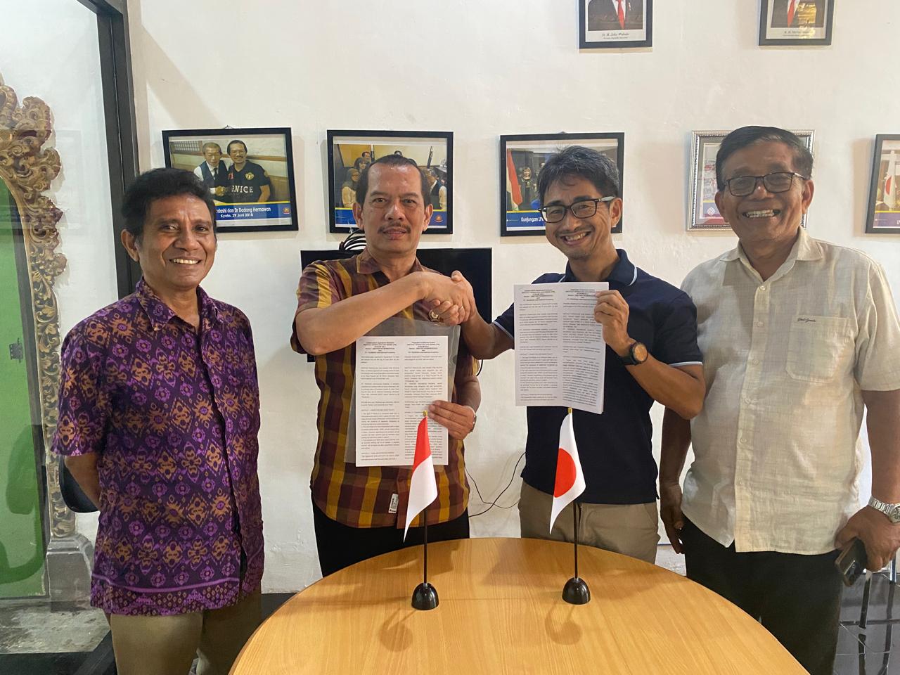 TEKEN MOU – Rektor ITB STIKOM Bali Dr. Dadang Hermawan dan Presiden Direktur TSUBASA Internasional Academy, Yoshiyuki Kyomoto, menandatangani MoU pengiriman mahasiswa ke Jepang, disaksikan Rahman Sabon Nama dan Dede Heryadhy bertempat di kantor LPK DARMA Denpasar, Kamis, 6 Juni 2024.